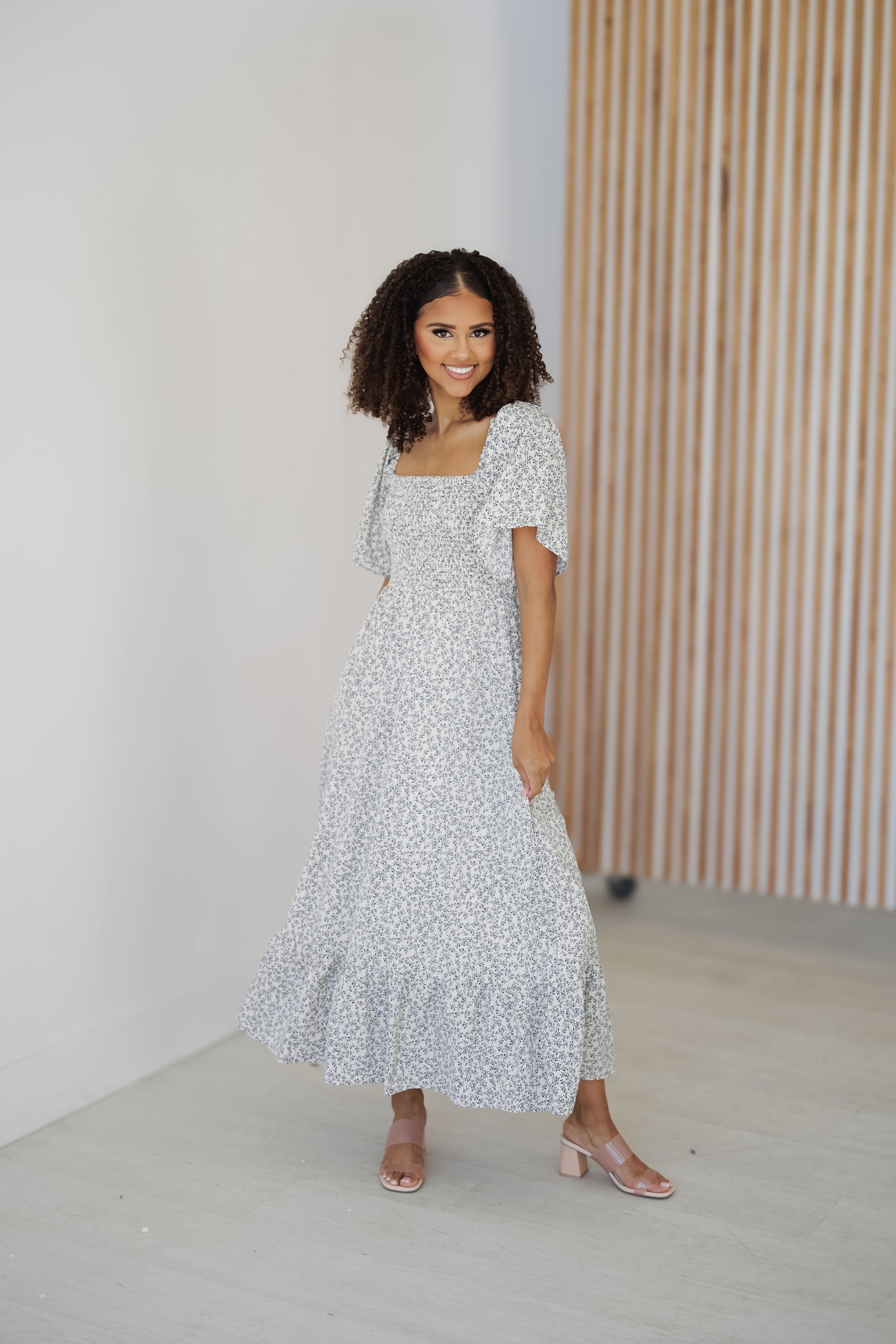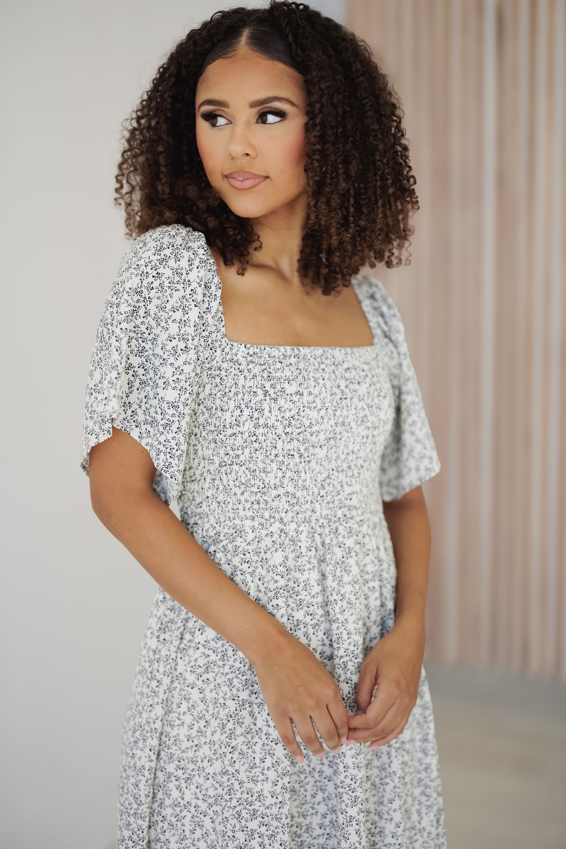 Omfavn enkel sjarm med "Alicia Kjole!" Denne klassiske midi-kjolen er et fantastisk og tidløst valg for høsten, og passer også perfekt over i vinter. Med en hvit base og svarte blomster gjennom hele, sammen med et fullt smokkert topp og sidelommer, er denne kjolen lett flatterende. De korte, flytende ermene gjør denne kjolen enda mer feminin og allsidig!