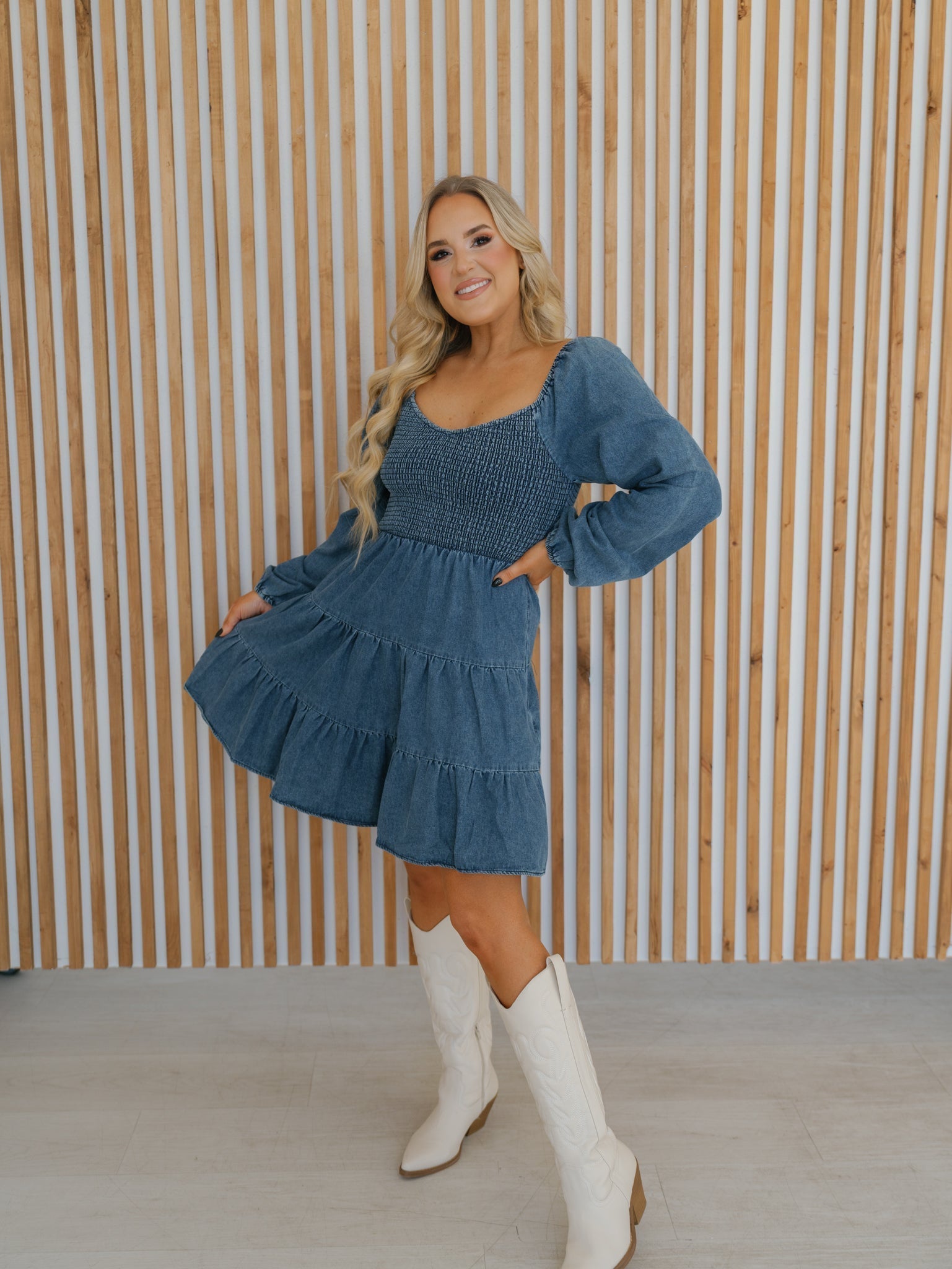 Snurr rundt i "Hope Mini Kjole!" En tidløs favoritt for ethvert skap, denne denim mini-kjolen er komplett med en fullt smokkert byste og rygg, lange ballongermer og et lagdelt skjørt. Perfekt for en avslappet dag på byen, en jentelunsj eller pyntet til en babyshower!