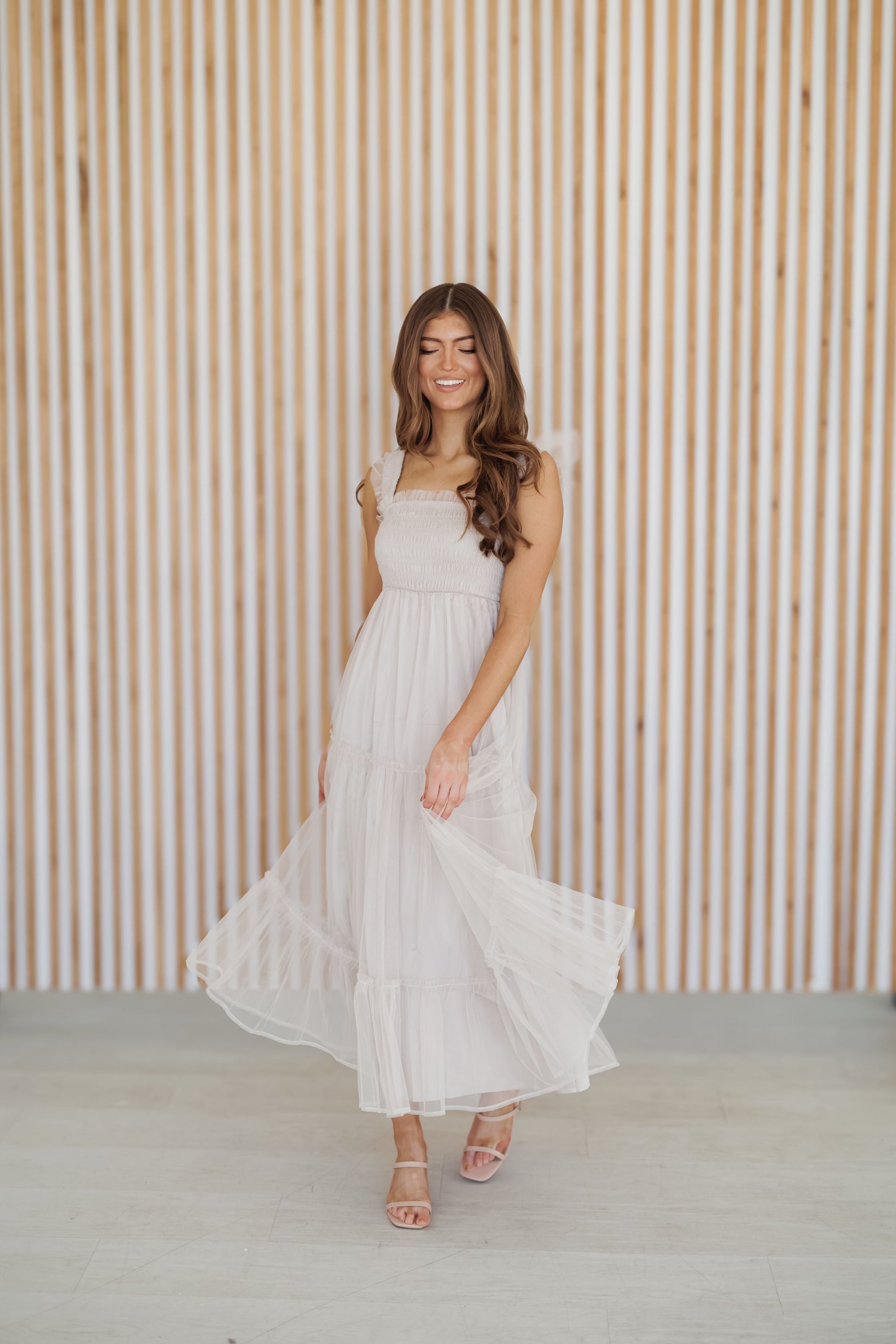 Dra oppmerksomheten til deg med "Roxanne Kjole!" Du vil være perfekt for enhver spesiell høytidsanledning i denne champagnefargede tulle midi-kjolen! Den har en fullt smokkert byste som gir en komfortabel passform, sammen med et lagdelt tulle-skjørt. Denne kjolen er perfekt å bruke med høye hæler for en festlig date night eller juleservice i kirken!
